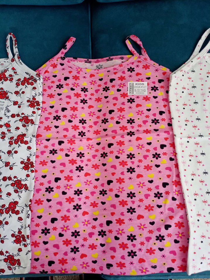 İnce askılı, pembe zemin üzerinde çeşitli çiçek desenleri bulunan renkli kız çocuk atleti. Günlük kullanım için uygundur.