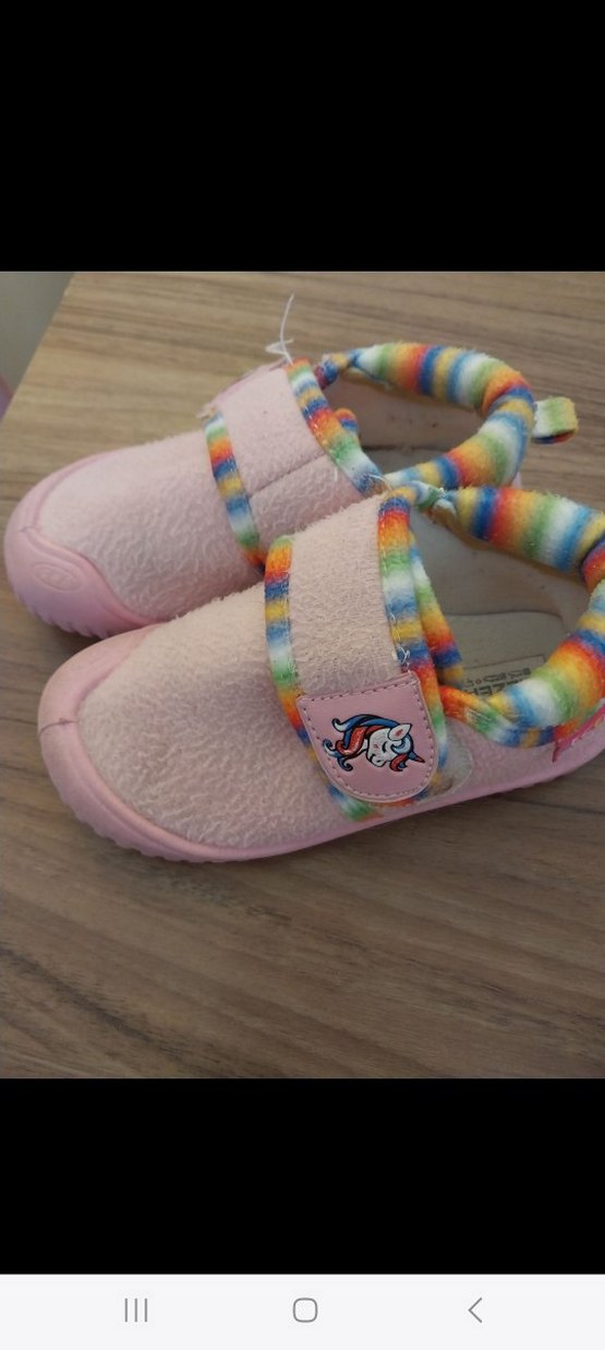 Yumuşak pembe kürk kumaş, renkli batik desenli kenar ve unicorn detaylı cırt cırtlı kız çocuk ev terliği. #evayakkabisi #cocukpanduf disarda da giyebilirsiniz ben ev de giydirdim ayakkabıyı dışarıda giyilmedi sorunsuz