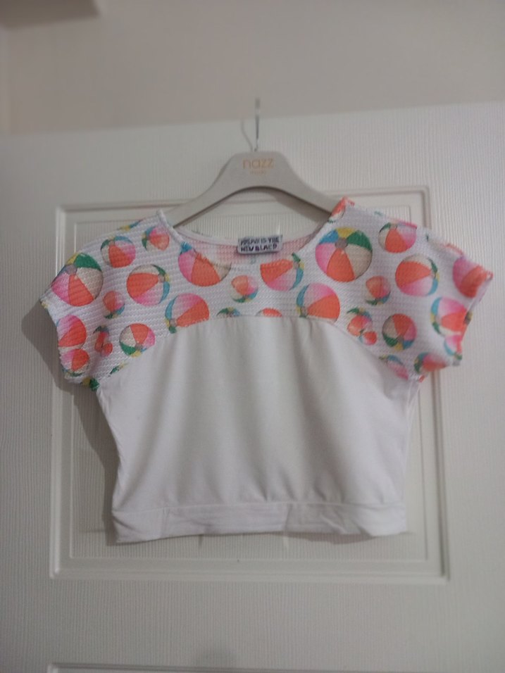 Renkli baskılı plise detaya sahip, yuvarlak yakalı, kısa kollu ve bol kesim kız çocuk tişörtü, yumuşak sentetik kumaştan.