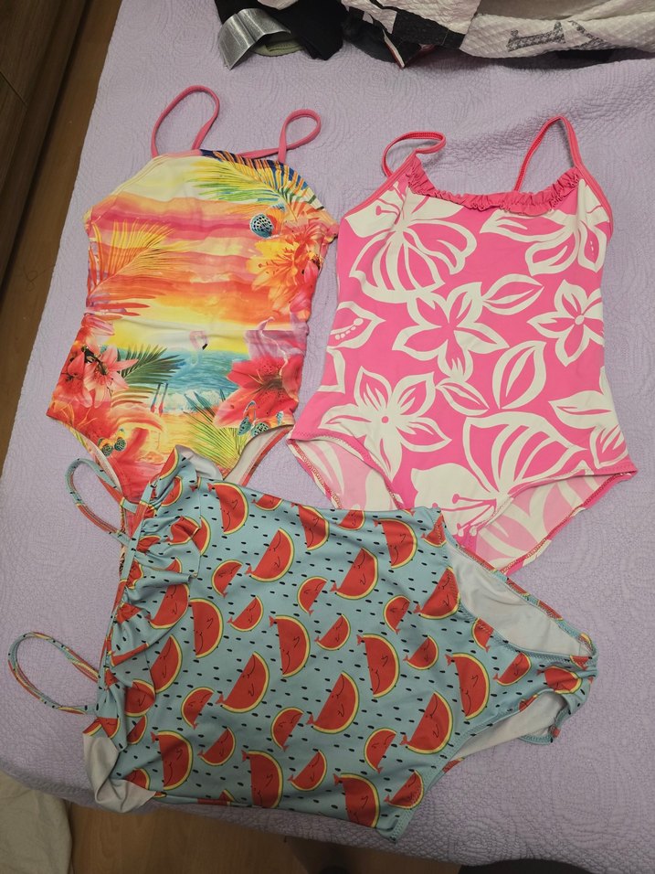 Tropikal, çiçek ve karpuz desenli, renkli, askılı kız çocuk mayoları , plaj için uygun.