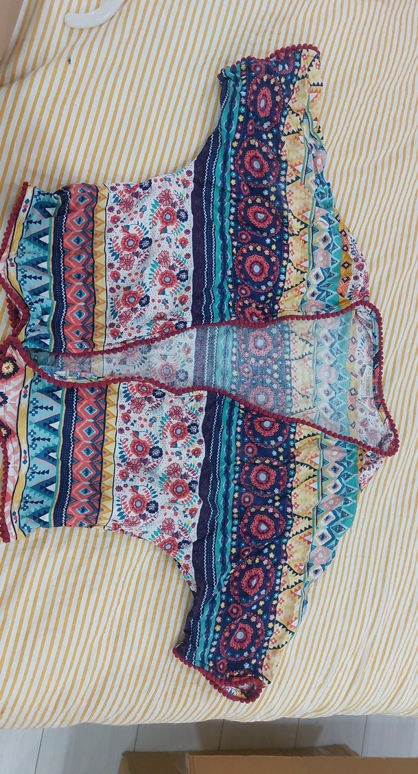 Renkli, desenli kız çocuk panco, bol kesim, tekne yaka ve kısa kollu. Yumuşak tekstilden, bohem tarzda ve fırfır detaylıdır.