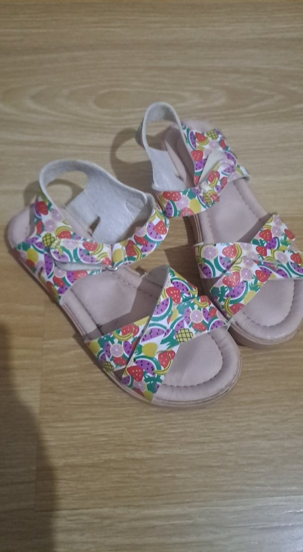 Renkli meyve desenli, tokalı kız çocuk sandaletleri, kauçuk malzemeden yapılmıştır.