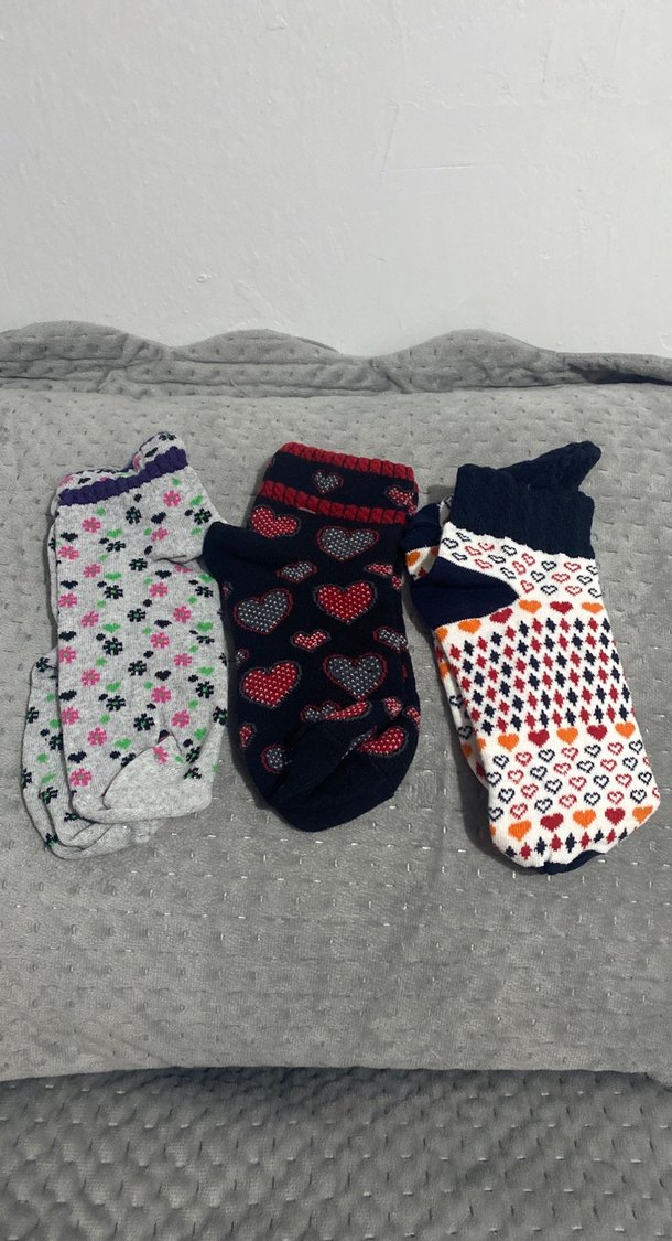 Kızlar için çeşitli kalp ve çiçek desenlerine sahip renkli örme çorap seti. Yumuşak ve rahat dokusu ile günlük kullanım için uygundur.