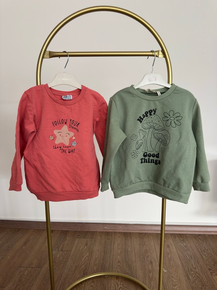 Renkli pembe kız sweatshirtü, yuvarlak yaka, uzun kollu ve bol kesimdir. Yumuşak polar kumaştan, örme detaylıdır. "Things" ve "Good" yazılı baskısı vardır.