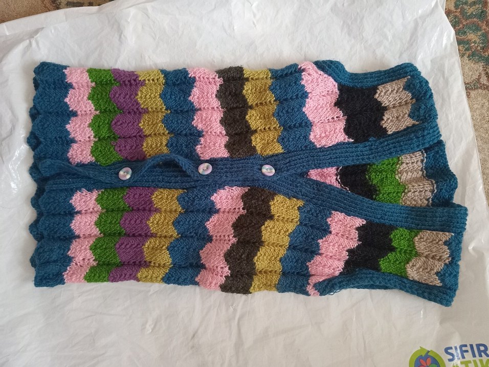Renkli ve desenli triko örgüden yapılmış, askılı kollu, bohem tarzda, fitted kesim kız hırkası.