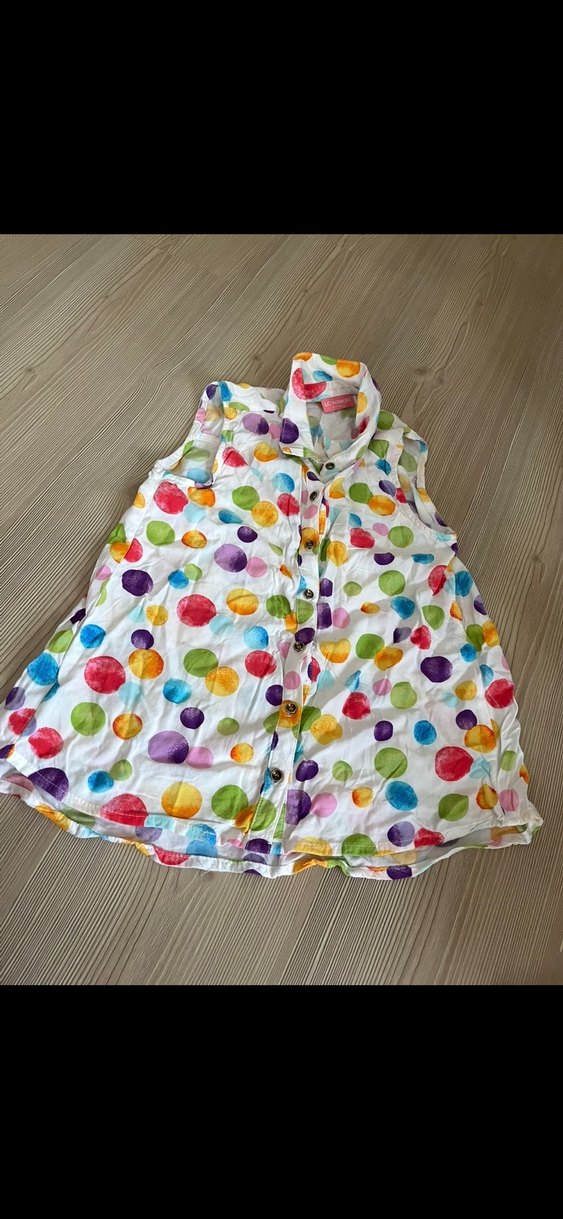 Yumuşak pamuktan, renkli bağlama desenli, kolsuz, düğmeli önü ve yakalı, bol kesim kız bluzu.
