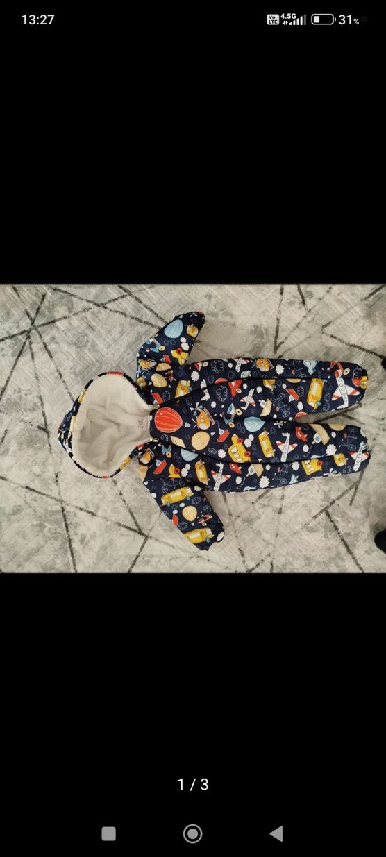 Renkli desenli, kapüşonunda kürk detaylı bebek tulumu. Sıcak ve yumuşak kumaştan üretilmiştir. 6-9 ay uyumludur.