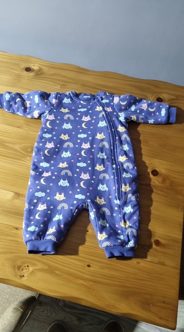 Yumuşak ve sıcak kumaştan yapılmış, sevimli hayvan ve gökkuşağı desenli renkli mavi bebek tulumu. Uzun kollu ve kolay giyilmesi için fermuarlı. Bebeğime küçük geldiği için sadece bir kere giydi.