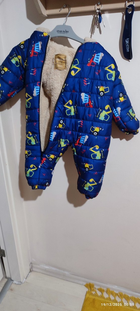 Renkli desenlere sahip mavi bebek tulumu, yumuşak ve sıcak kumaştan yapılmıştır. Önden fermuarlıdır ve sokak stili için uygundur. ❄️