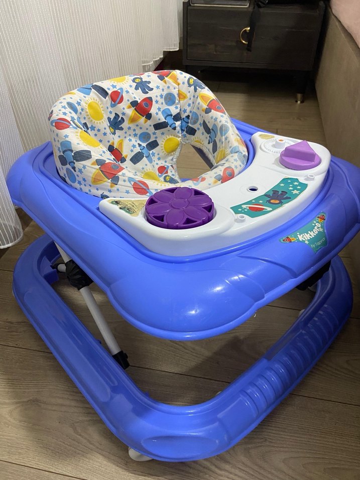 Renkli desenlere sahip konforlu oturma kısmı ve sağlam mavi çerçevesi olan bebek yürüteci. Oyuncaklarıyla bebeği eğlendirir.