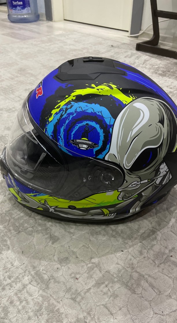 Renkli desenli mavi biker kask, tokalı kapama ve yumuşak kürk iç yüzeye sahiptir. Şeffaf vizörü koruma sağlar. ️