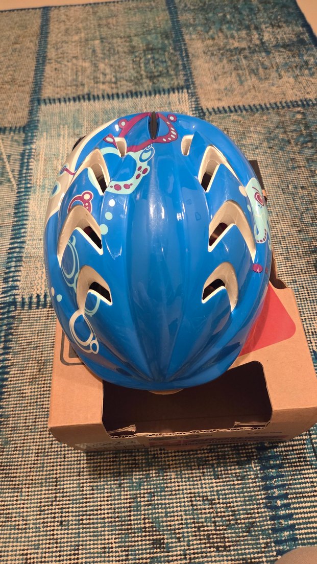 Renkli baskılı desenlere sahip mavi plastik bisiklet kaskı, tokalı kapanışlıdır ve bohem, retro tarzını yansıtır. Az kullanılmıştır,yaş:8