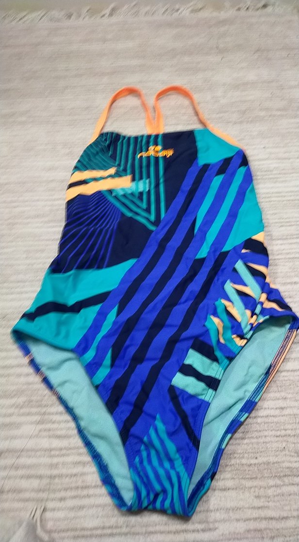Mavi tonlarda renkli geometrik desenlere sahip, ince askılı ve drapeli tasarımlı, vücuda oturan cocuk mayo.
