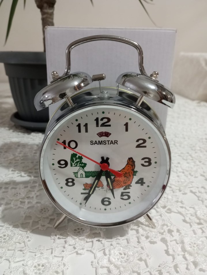 Metal çerçeveli, beyaz kadranlı ve renkli horoz desenli çalar saat. Üstte çift zil ve kulp bulunur, nostaljik tarzda. ⏰
