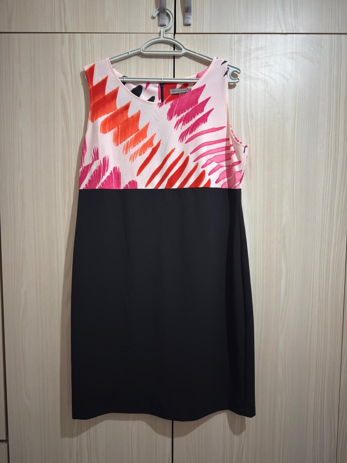 Üst kısmı renkli tie-dye desenli, alt kısmı siyah olan, kolsuz ve vücuda oturan hamile elbisesi. Ofis için uygun, pile detaylı.