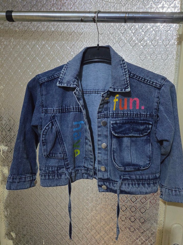 Renkli desenli, düğmeli mini kot ceket. Uzun kollu, cepli ve bol kesim. Casual sokak tarzı için uygun. 'fun.' yazılı detaylar içerir.