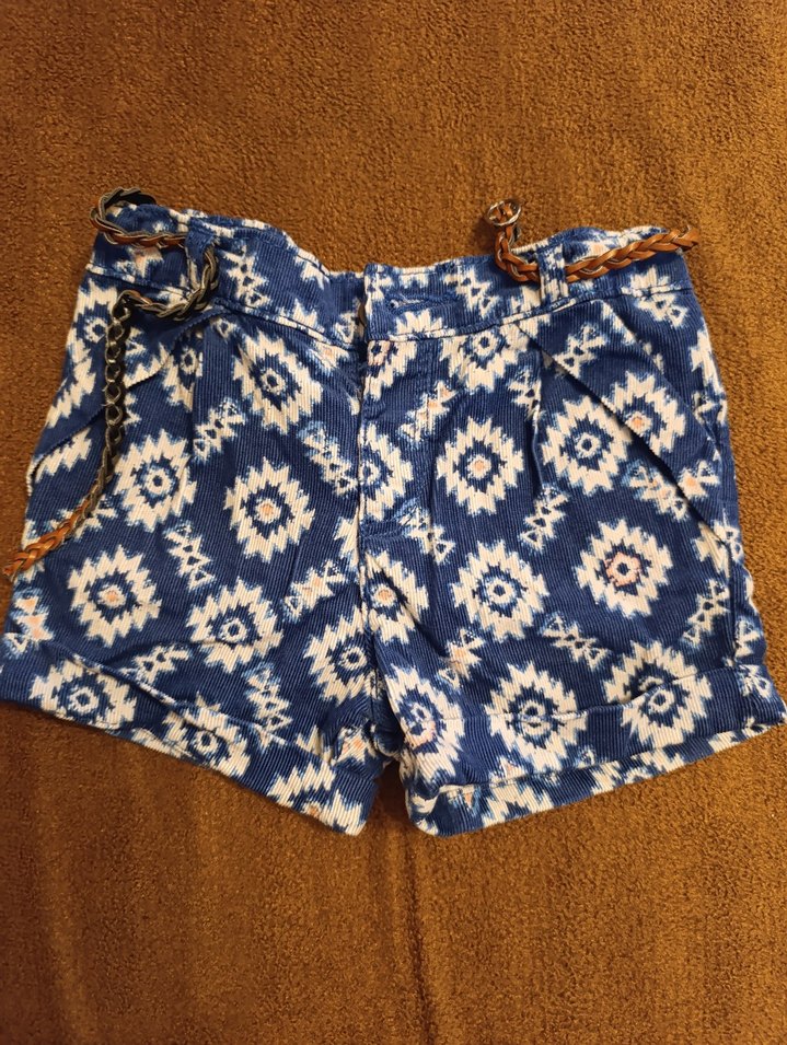 Renkli mavi desenli, bel kemerli, bol kesim mini şort kadife