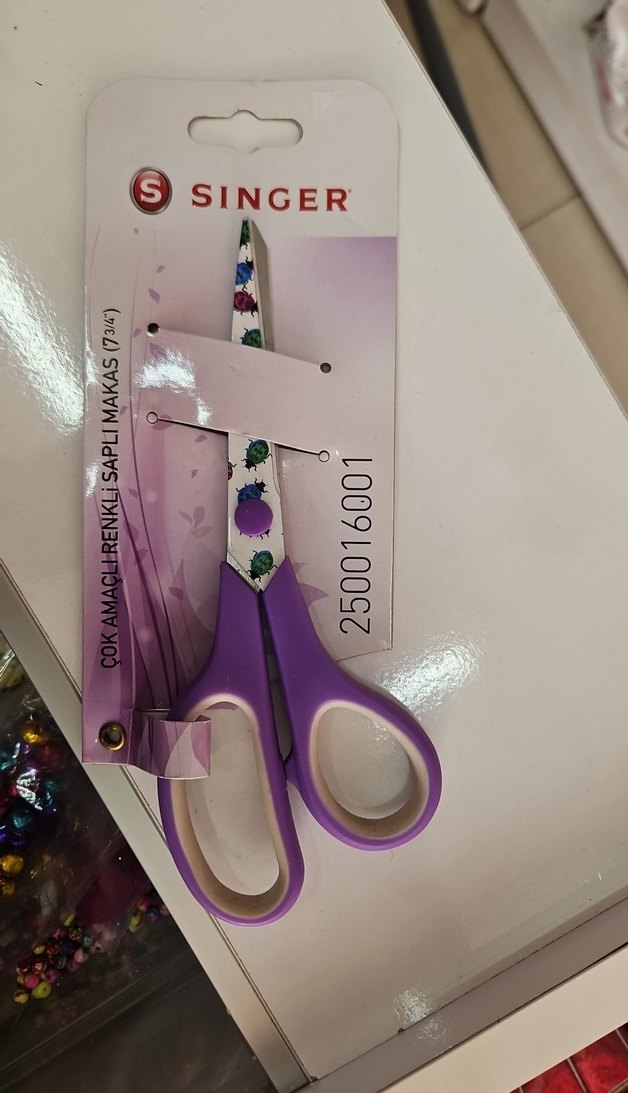 Çiçek desenli renkli bıçaklara sahip, 17 cm uzunluğunda mor makas. Marka: Singer. ✂️