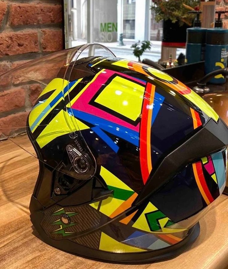 Renkli desenlere sahip JK520 motor kaskı vizöründe ve kaskın bazı bölgelerinde ufak ufak bir kaç çizik bulunuyor çok yakından bakılmadıkça anlaşılmıyor herhangi bir kusura sahip değil defosuz gözlüklü motor kaskı