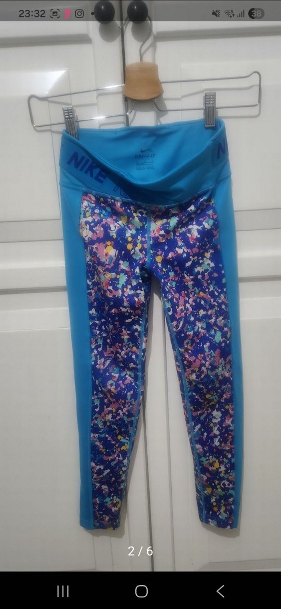 Renkli desenli ön panel ve yanlarda düz mavi kumaşlı, elastik bel bantlı Nike spor tayt.