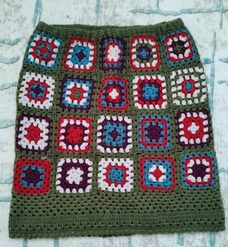 Koyu renkli, çeşitli renklerde desenli karelerden oluşan çok renkli örgü battaniye.