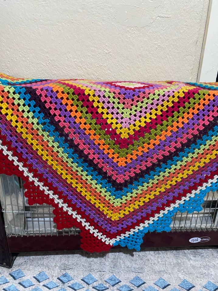Canlı renklerde, desenli örgü battaniye, her mekana sıcaklık ve şıklık katmak için ideal.