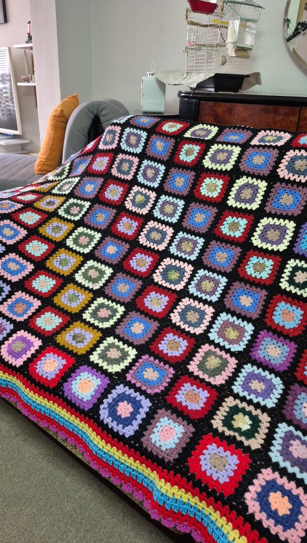 Koyu renkli, çok renkli kare desenlerden oluşan örgü tarzı desenli battaniye. Sıcak ve canlı bir görünüm sağlar. boyu 1.90 eni 1.25 ölçüler az çok farklılık gösterebilir