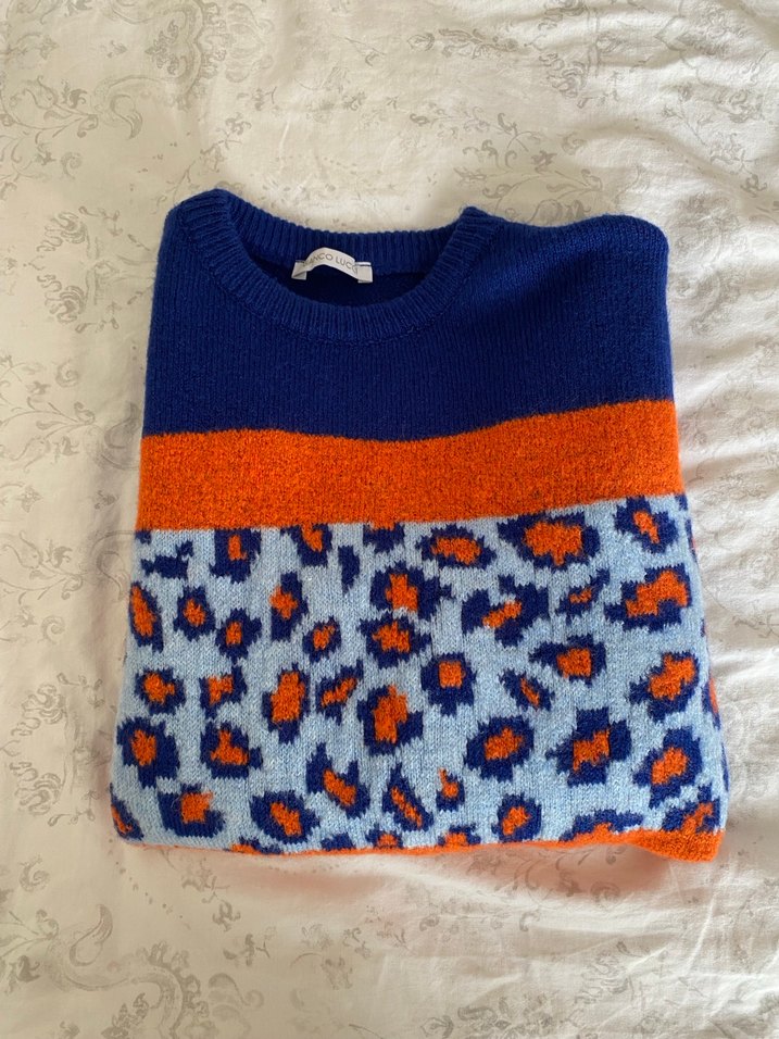 Uzun kollu, yuvarlak yakalı, renkli desenli örgü kadın kazak. Rahat bol kesim, günlük kullanım için uygundur.