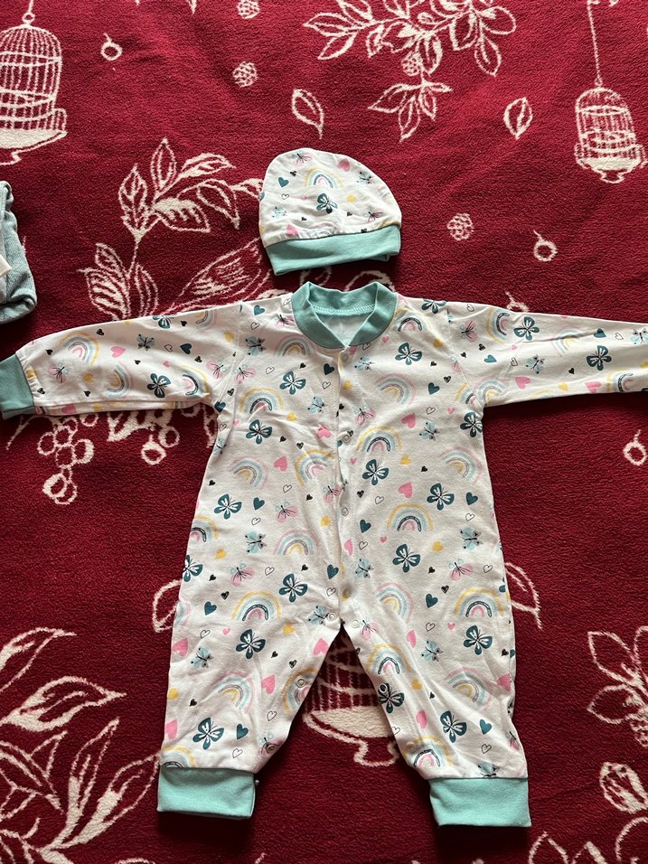Renkli kız bebek tulumu. Uyumu sağlayan şapka ve rahat manşetlere sahiptir. Kusuru fotoğrafta mevcut