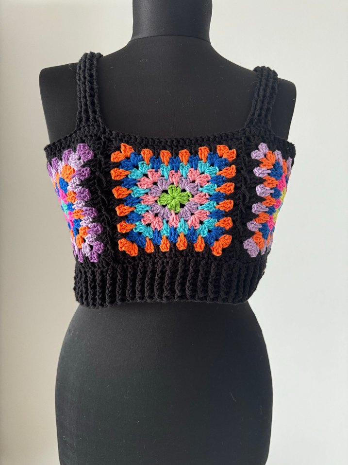 Renkli desenli örgü, kısa kesim ve askılı bohem stil kadın büstiyer, günlük kullanıma uygundur. İsterseniz bikini üzerine, isterseniz gömlek içine giyebileceğiniz şık bir tasarım 34 38 beden uyumludur Tüylenme yapmaz 30° soğuk makine yıkaması uygun