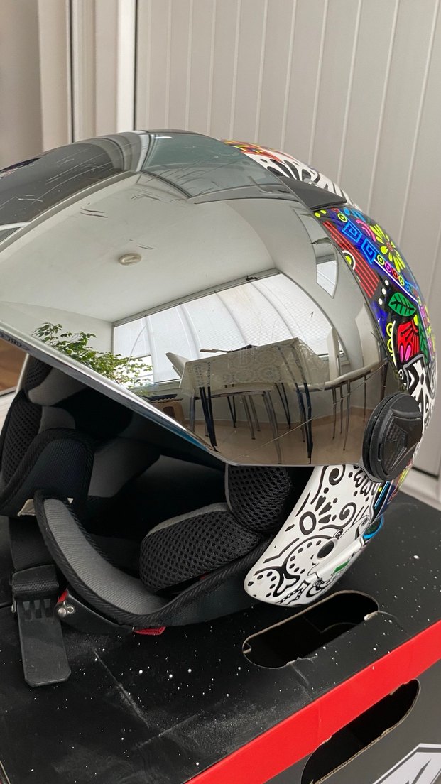 Renkli desenlere sahip, parlak metal yüzeyli motosiklet kaskı. Bohem ve retro sokak stilini yansıtan, içi rahat dolgulu bir model. Düşmeden dolayı çizikler mevcut. Sway marka