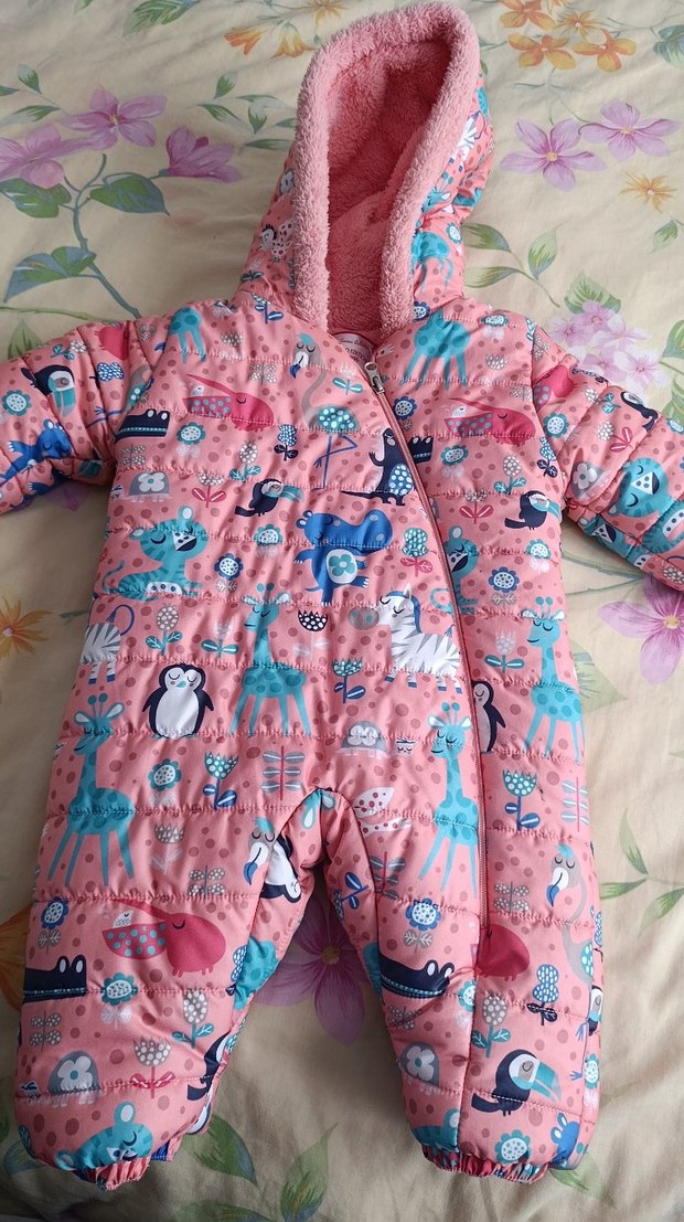 Renkli desenlere sahip pembe bebek kız tulumu, kapüşonunda kürk detayları ile sıcak tutar. ❄️