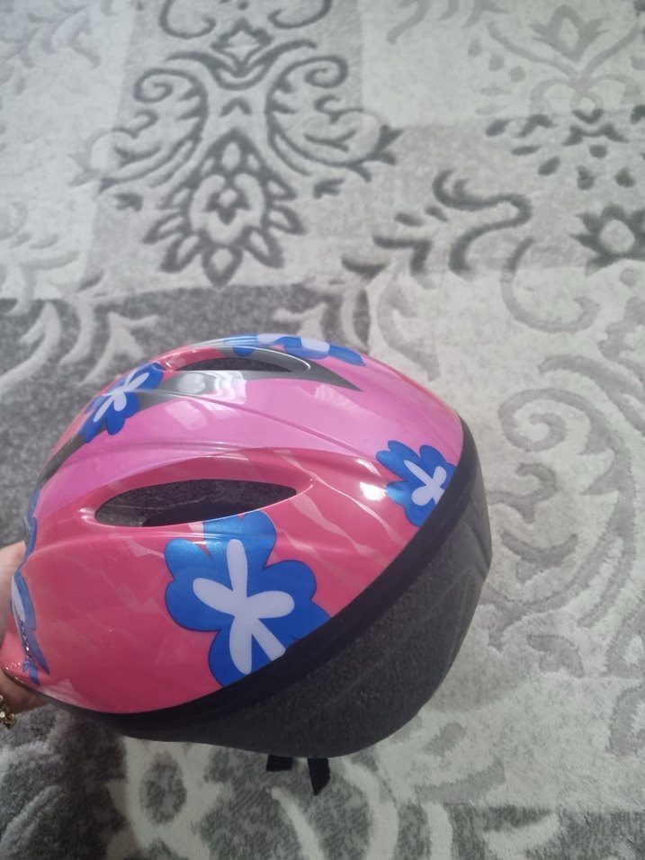 Pembe, lastik malzemeden yapılmış, renkli çiçek desenlerine sahip ve elastik özellikli bisiklet kaskı.