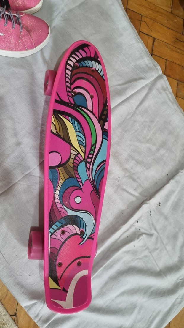 Renkli soyut desenlere sahip pembe çocuk kaykay, eğlenceli ve şık bir tasarıma sahiptir. tekerlekleri ışıklı.