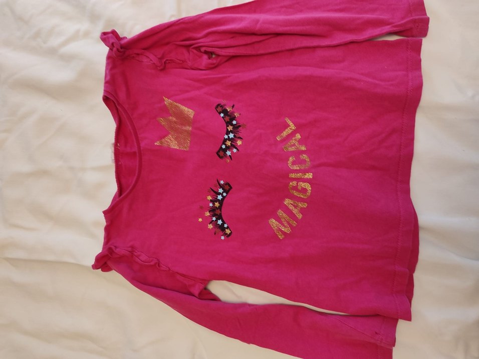 6-7 yaş için, renkli desenli pembe çocuk üst. Üzerinde 116-1220 kodu bulunur.