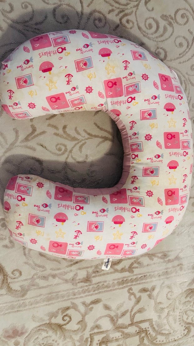 Renkli desenlere sahip pembe emzirme ve hamile yastığı, konfor ve destek sağlar.