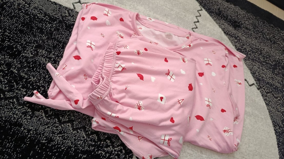 Kadın pijama takımı, kısa kollu ve kısa boyda, bol kesimdir. Pembe renginde, renkli kalp ve hediye desenleriyle rahat bir sokak tarzı sunar. 1 2 defa giyildi
