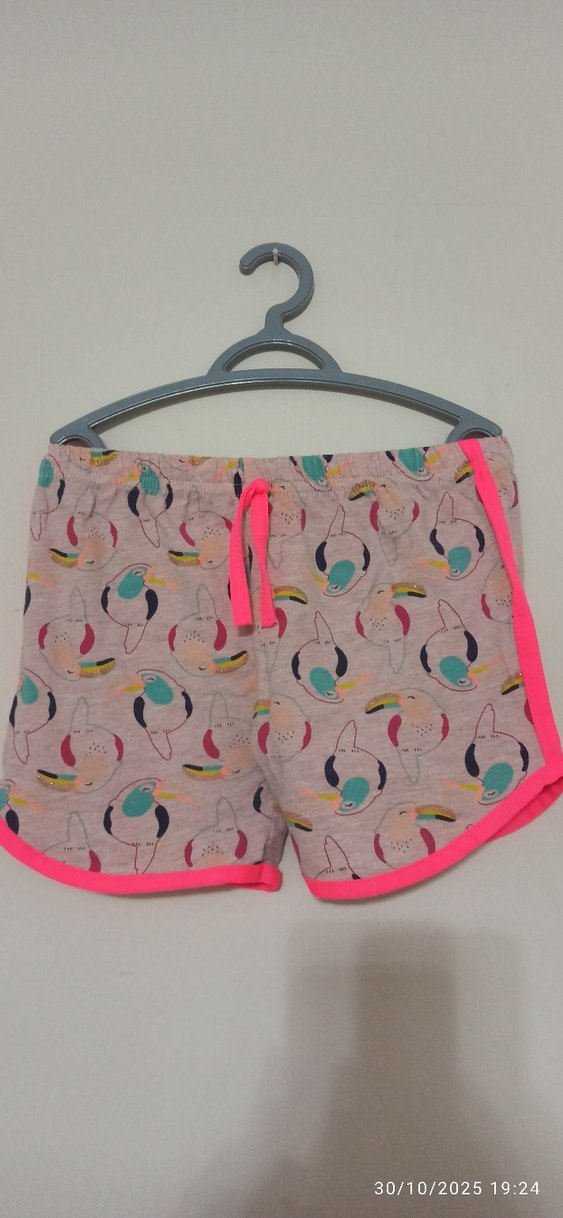 Renkli desenli, bol kesim pembe kız şortu, elastik bel ve canlı pembe şerit detaylı, rahat sokak stili için uygun.