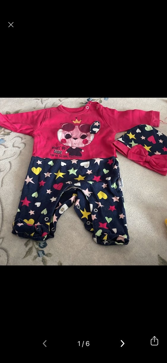 Renkli desenli, örgü dokulu pembe bebek tulumu. Üstü sevimli baskılı, altı yıldız ve kalp desenli lacivert pantolonlu, eşleşen şapkalı. Sıkıntısı yoktr cok tatlı tulumdur sapkası hıc kullanılmamıstır
