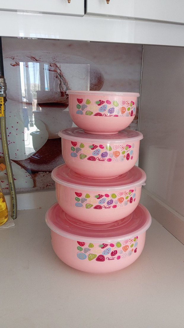 Renkli meyve desenli, hava geçirmez kapaklı pembe saklama kabı seti.