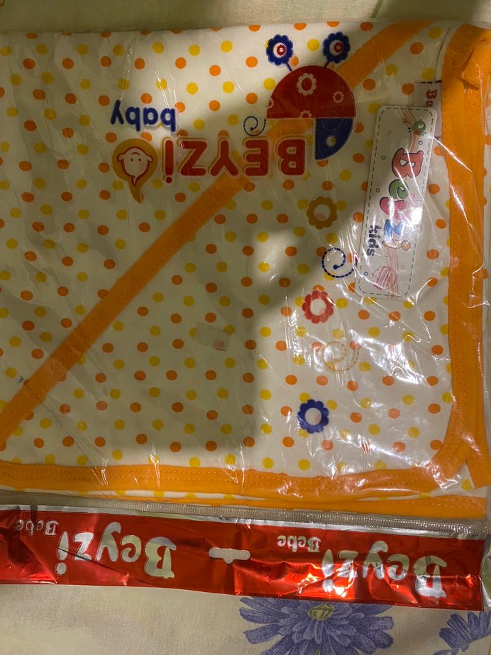 Renkli desenlere sahip, plastik malzemeden yapılmış bebek battaniyesi.