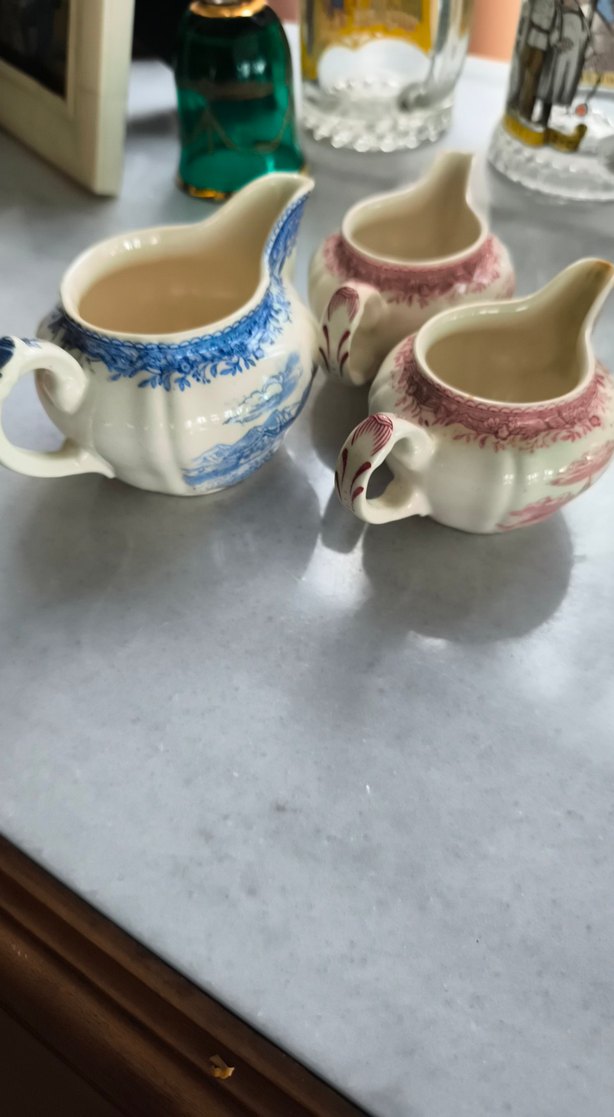 Beyaz taban üzerine mavi ve kırmızı desenli, kulplu ve dökme ağızlı renkli seramik sütlük seti. ☕mavi 600tl