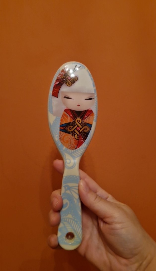 Saç fırçası, arka yüzünde stilize bebek figürü bulunan renkli desenlidir ve asma deliği olan rahat bir sapı vardır. #kimmidoll