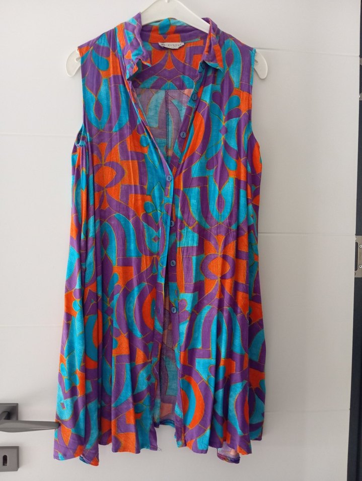 Kolsuz, renkli desenli elbise. Salaş kesimi ve drapeli tasarımı ile uzun boylu, günlük kullanım için uygun.