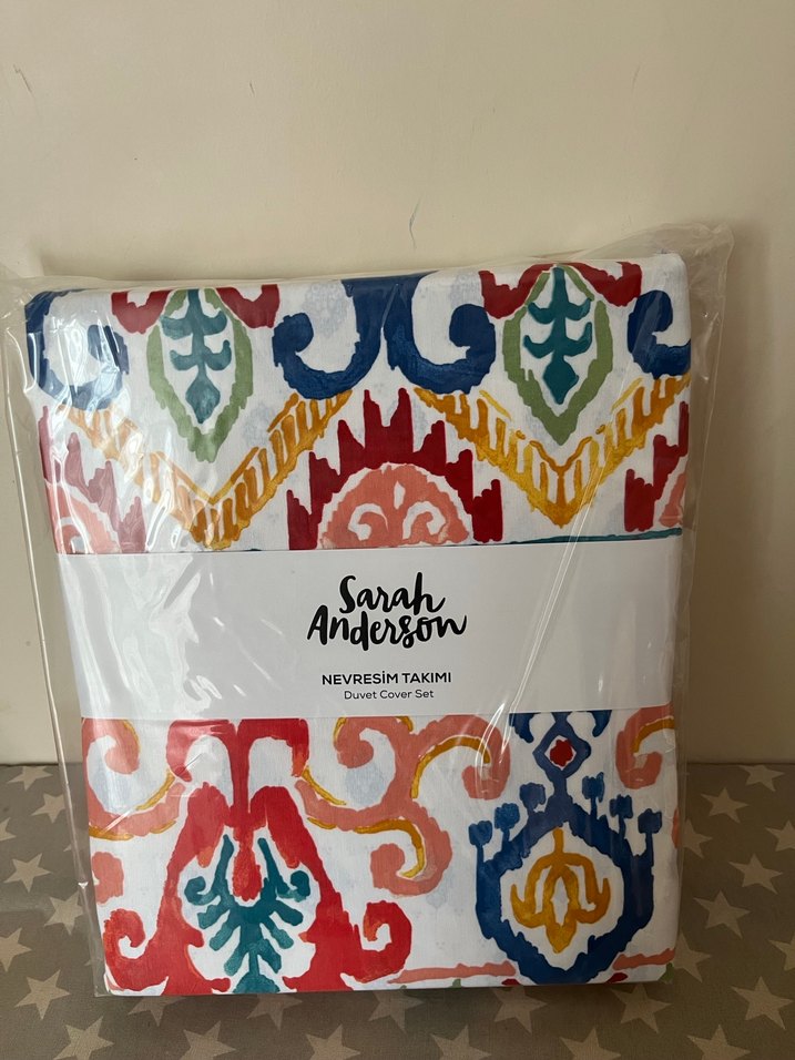 Sarah Anderson nevresim takımı, açık ve çok renkli desenleriyle yatak odanıza canlılık katar.