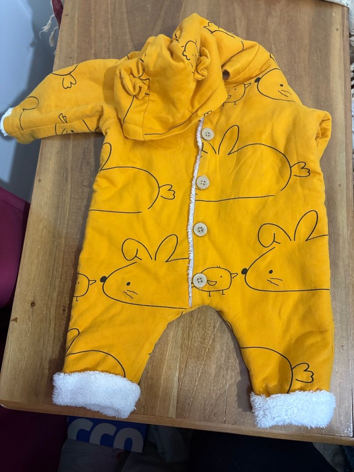 Renkli desenli sarı bebek tulumu, düğmeli ve yumuşak, sıcak kumaştan üretilmiştir. Sokak stili için uygundur. 3-6 ay için uygun
