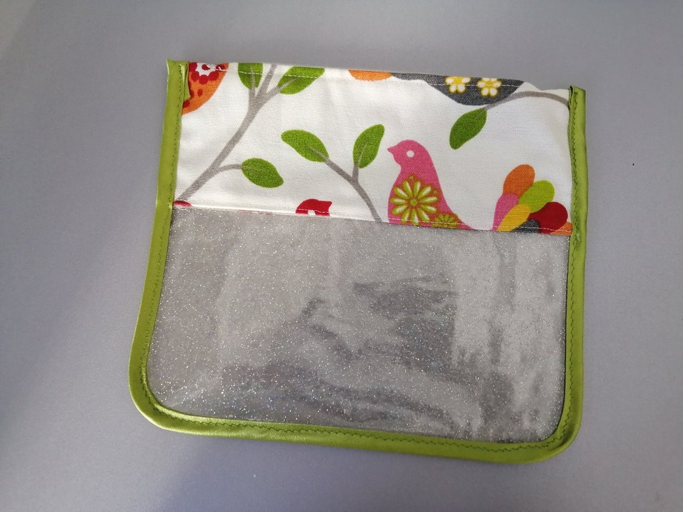 Bej zemin üzerine renkli kuş ve yaprak desenli, ön kısmı şeffaf olan organizer. Düzgün kenar süslemeleri bulunur.