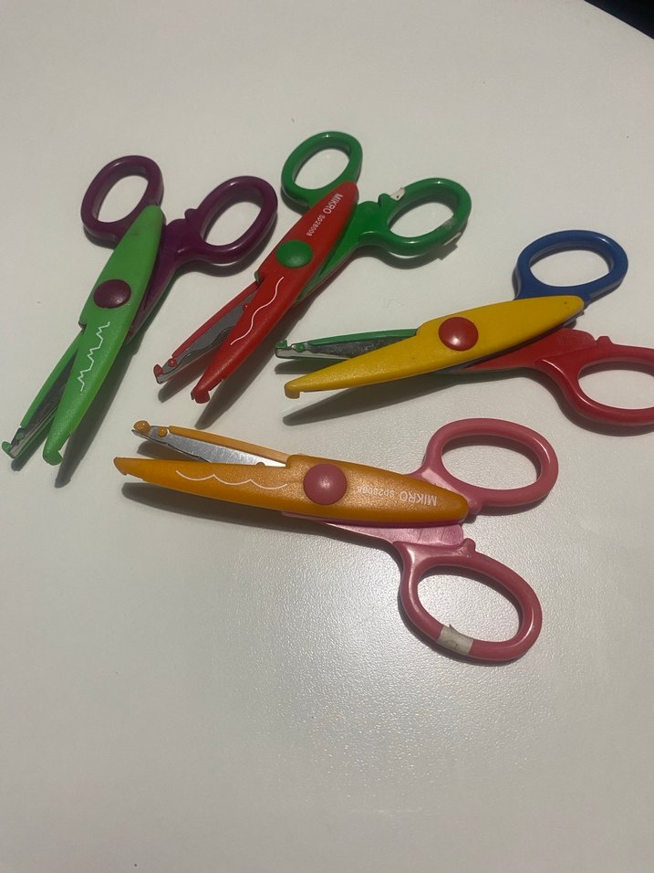 Okul etkinlikleri için farklı desenli renkli makas seti. ✂️