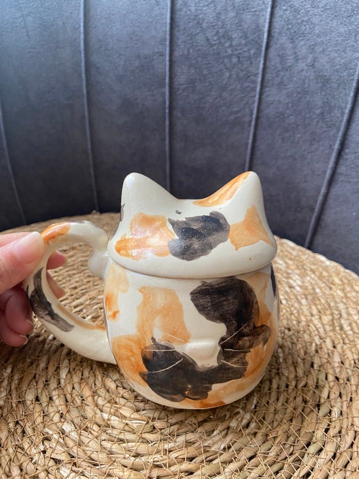 Bu seramik kupa, kedi şeklinde kapak ve renkli desenlerle işlenmiş, hem kullanışlı hem şık bir üründür. Kullanılmadı.