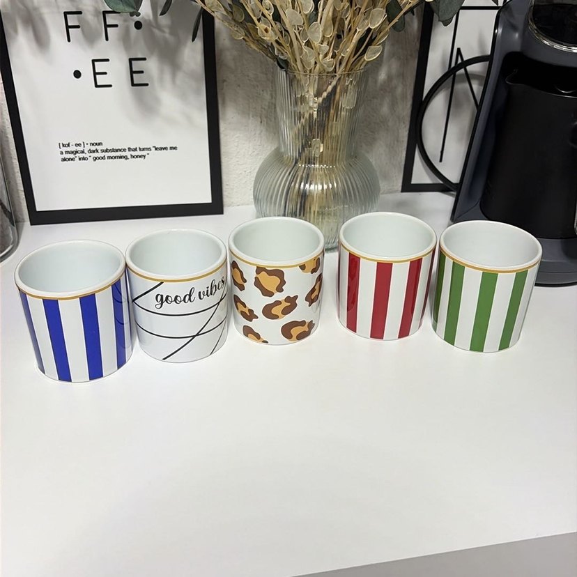 Çizgili, leopar desenli ve "good vibes" yazılı renkli seramik kupalar seti. ☕ Adet fiyatıdır